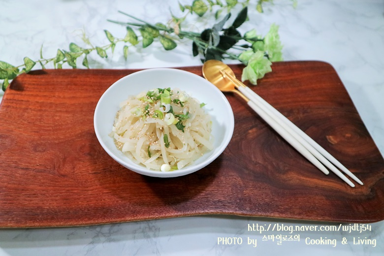 먼저 무 300g을 준비해주세요. 무는 껍질을 깨끗하게 벗겨내고, 약 0.5cm 두께로 채 썰어줍니다. 칼로 써는 것이 번거롭다면, 채칼을 이용하면 편리하며, 약간 도톰하게 썰어도 식감이 좋습니다.