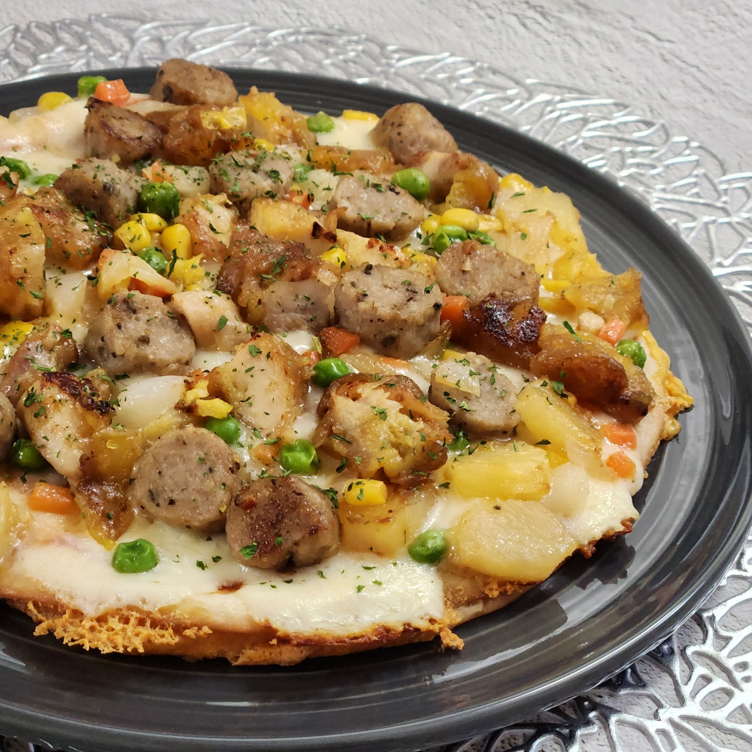 치킨은 한 입 크기보다 살짝 크게 썰어주고, 슬라이스 파인애플과 소시지도 비슷한 크기로 썰어줍니다. 양파와 당근은 굵은 채썰기 또는 잘게 다져 준비합니다. 채소가 작게 썰어야 익는 속도가 빨라지고 토핑이 잘 어우러집니다.