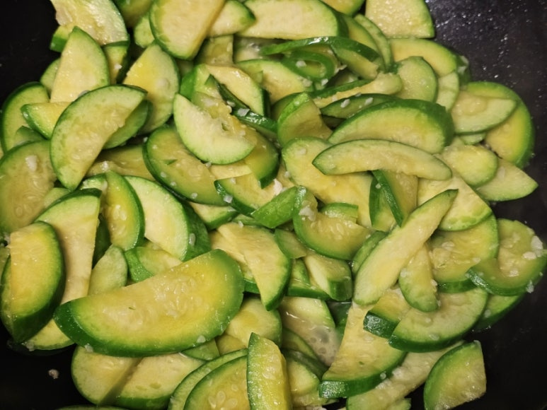 애호박을 프라이팬에 넣은 후, 바로 다진 마늘 1/2큰술을 애호박 위에 골고루 뿌려줍니다. 이렇게 마늘을 함께 넣고 볶으면 향긋한 마늘 향이 애호박에 배어 더욱 맛있어져요.