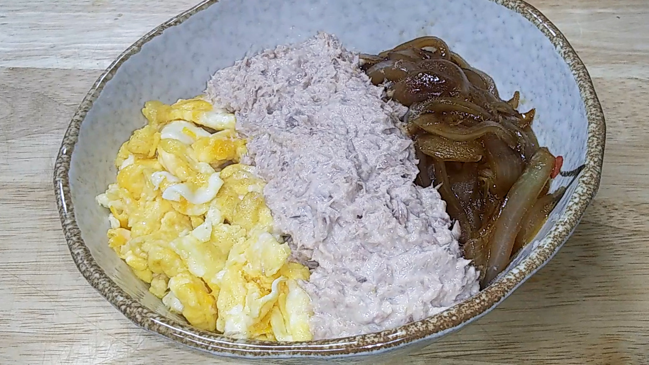 마지막으로, 따뜻한 밥 1인분을 그릇에 담고, 그 위에 준비한 참치마요, 달콤짭짤한 양파 볶음, 그리고 부드러운 스크램블 에그를 보기 좋게 한 줄씩 올려주세요. 이렇게 간단하면서도 맛있는 참치마요 덮밥이 완성되었습니다! 취향에 따라 김 가루나 깨소금을 뿌려 드셔도 좋아요. 맛있게 드세요!