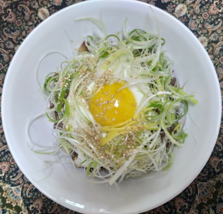 마무리로 통깨를 솔솔 뿌려 고소함을 더하고, 일본식 규동처럼 곁들이기 위해 생강채를 몇 가닥 올려주세요. 쯔유(우동 다시)와 생강이 규동의 특징인데, 소불고기와 살짝 섞어 한국식 덮밥에 적용해보니 의외로 잘 어울리더라고요! 만약 생강향이 부담스럽다면 올리지 않으셔도 괜찮습니다. 또한, 생파의 알싸한 맛이 싫으시다면 고기를 볶을 때 함께 볶아 올려도 좋아요. 저는 파채를 좋아해서 신선하고 상큼하게 즐기는 편입니다. 취향껏 조절해서 맛있게 즐겨보세요!