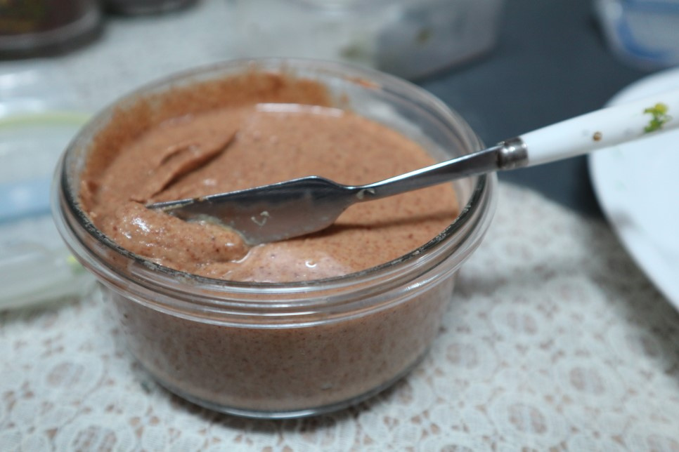 믹서기를 계속 작동시키다 보니, 모터에서 연기가 나기 시작했어요! 믹서기의 과열을 방지하기 위해 즉시 작동을 멈추고 잠시 식혀주었습니다. 이 정도면 충분히 곱게 갈렸다고 판단될 때, 완성된 아몬드 버터를 깨끗한 유리 용기에 조심스럽게 옮겨 담습니다. 믹서기가 열을 받았을 때는 충분한 휴식을 주는 것이 중요합니다.