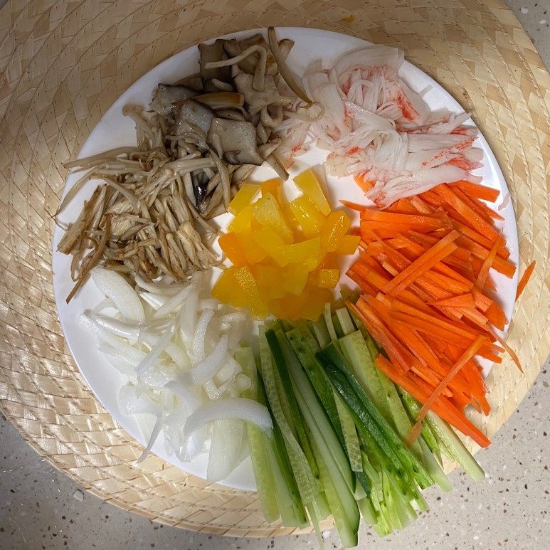 준비된 모든 채소와 크래미, 파인애플을 색깔별로 보기 좋게 접시에 예쁘게 담아내면 월남쌈 재료 준비는 끝입니다! 다양한 색감으로 보기에도 좋습니다.