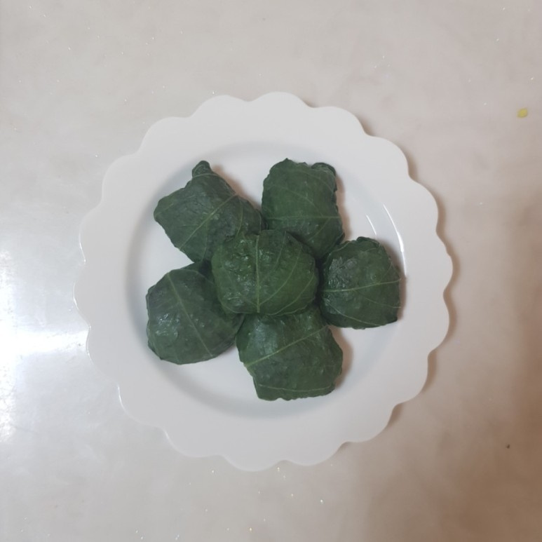 깻잎의 가장자리부터 조심스럽게 안쪽으로 접어 넣으며 돌돌 말아줍니다. 깻잎의 꼭지 부분을 아래로 향하게 하면 풀리지 않아요.