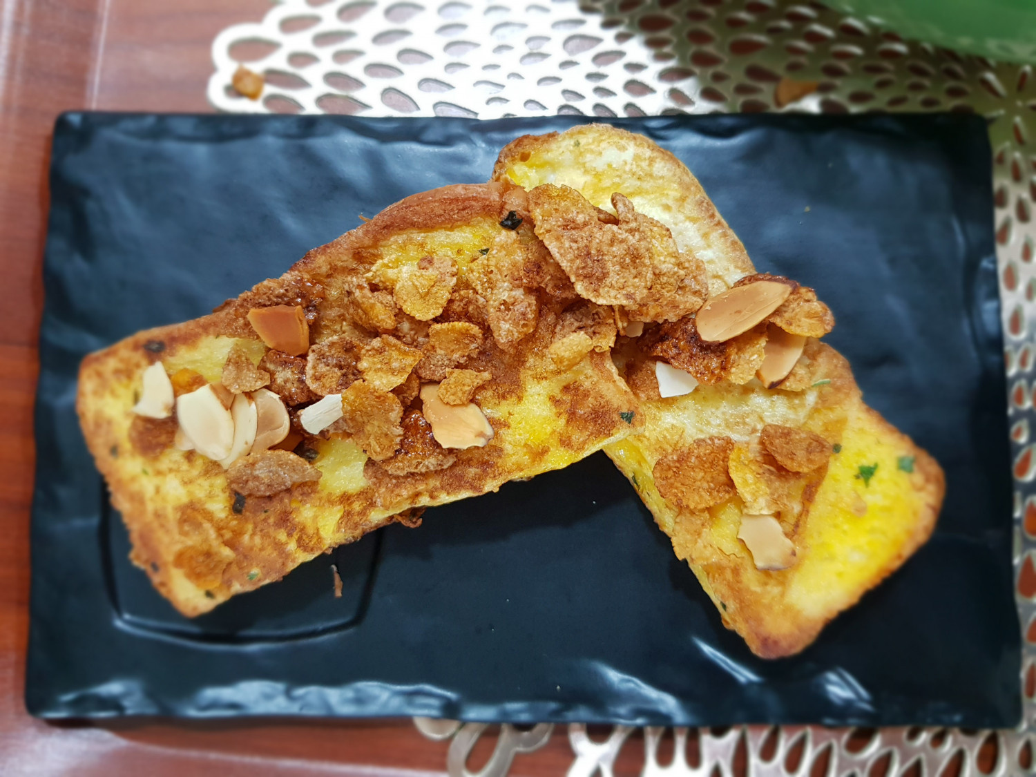 잘 구워진 식빵을 예쁜 접시에 보기 좋게 담아냅니다. 이제 이 맛있는 토스트를 더욱 특별하게 만들어줄 크런치함을 더할 차례예요. 준비해둔 시리얼 (콘플레이크가 특히 잘 어울려요!) 한 줌을 토스트 위에 솔솔 뿌려주세요. 바삭한 시리얼이 겉은 바삭, 속은 촉촉한 토스트와 환상적인 조화를 이룰 거예요. 이렇게 맛있는 크런치 토스트가 완성되었습니다! 남편과 함께 달콤하고 행복한 티타임을 즐겨보세요.