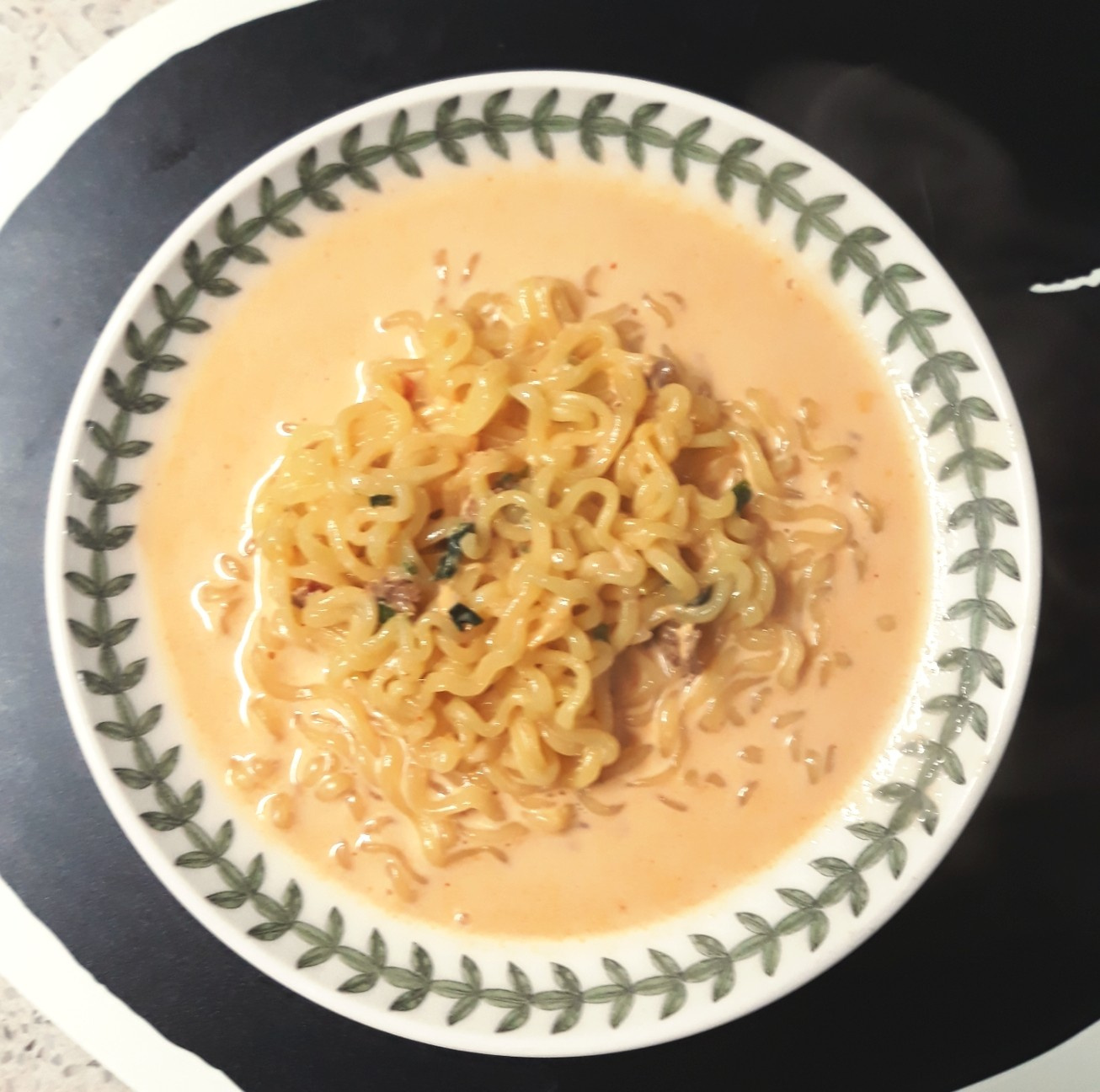 우유가 끓어오르면서 스프와 잘 섞이면, 70% 정도 익혀두었던 라면 사리를 넣고 면이 알맞게 익을 때까지 1~2분 더 끓여줍니다. 면이 부드럽게 익으면 불을 끄고, 완성된 우유라면을 예쁜 그릇에 담아내면 맛있는 고소한 우유라면 완성입니다!
