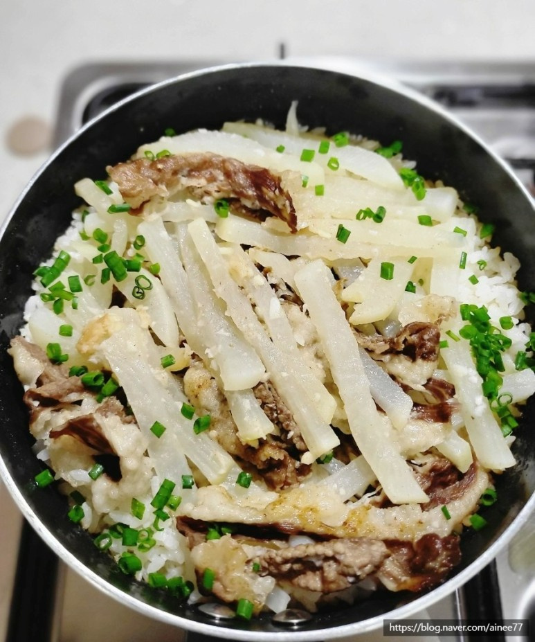 고소한 차돌박이와 달큰한 무로 짓는 영양 만점 차돌박이 무밥