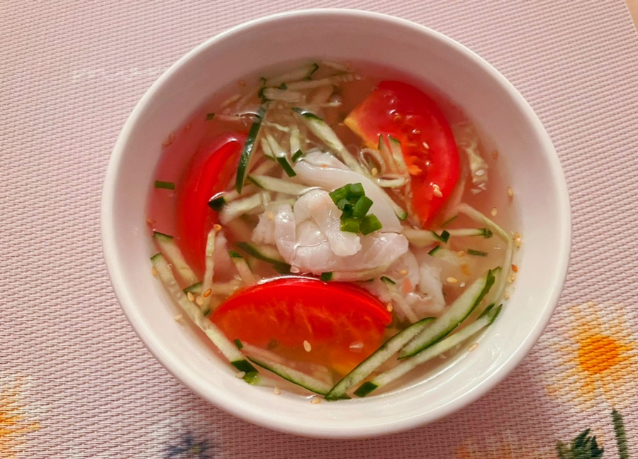낯설지만 익숙한 맛! 신선한 광어회와 새콤달콤한 채소가 어우러진 여름 별미, 광어 오이 토마토 냉국