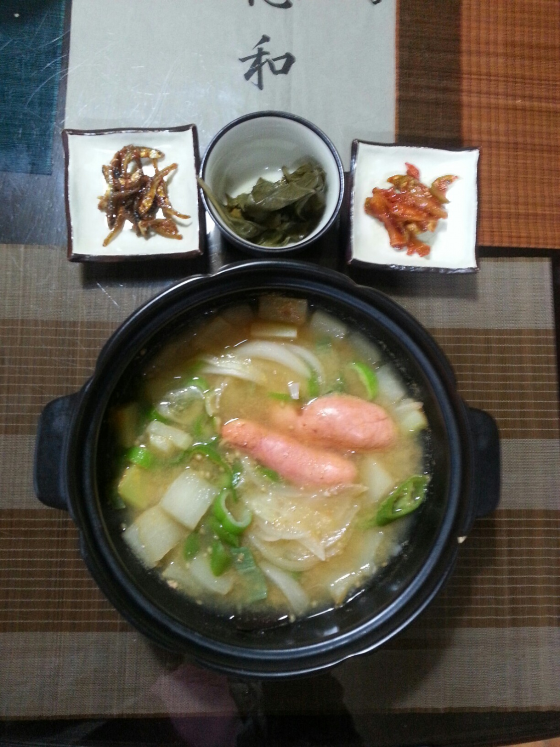 뚝배기나 냄비에 썰어둔 무와 다시마 조각, 그리고 된장을 함께 넣어줍니다.