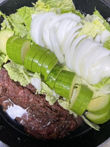 이제 전골을 끓일 냄비를 준비합니다. 냄비 바닥에 양념한 소고기를 먼저 깔아주세요. 그 위에 손질해 둔 배추, 애호박, 양파를 보기 좋게 올려줍니다. 모든 재료가 잠길 정도로 생수 1리터를 부어주세요.
