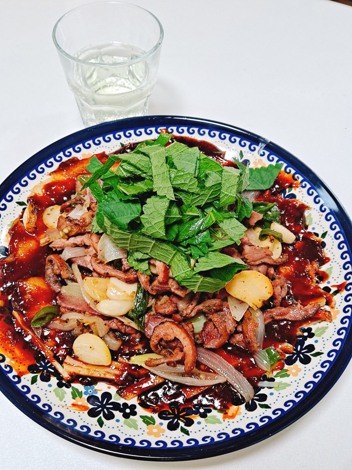 마지막으로, 미리 볶아두었던 훈제 오리 볶음을 감자채전 가운데에 먹음직스럽게 산처럼 쌓아 올립니다. 그 위로 채 썰어둔 깻잎을 소복하게 올려주면, 보기에도 좋고 맛도 훌륭한 ‘궁중 오리 훈제채와 감자채전 삼합’이 완성됩니다! 맛있게 즐기세요.