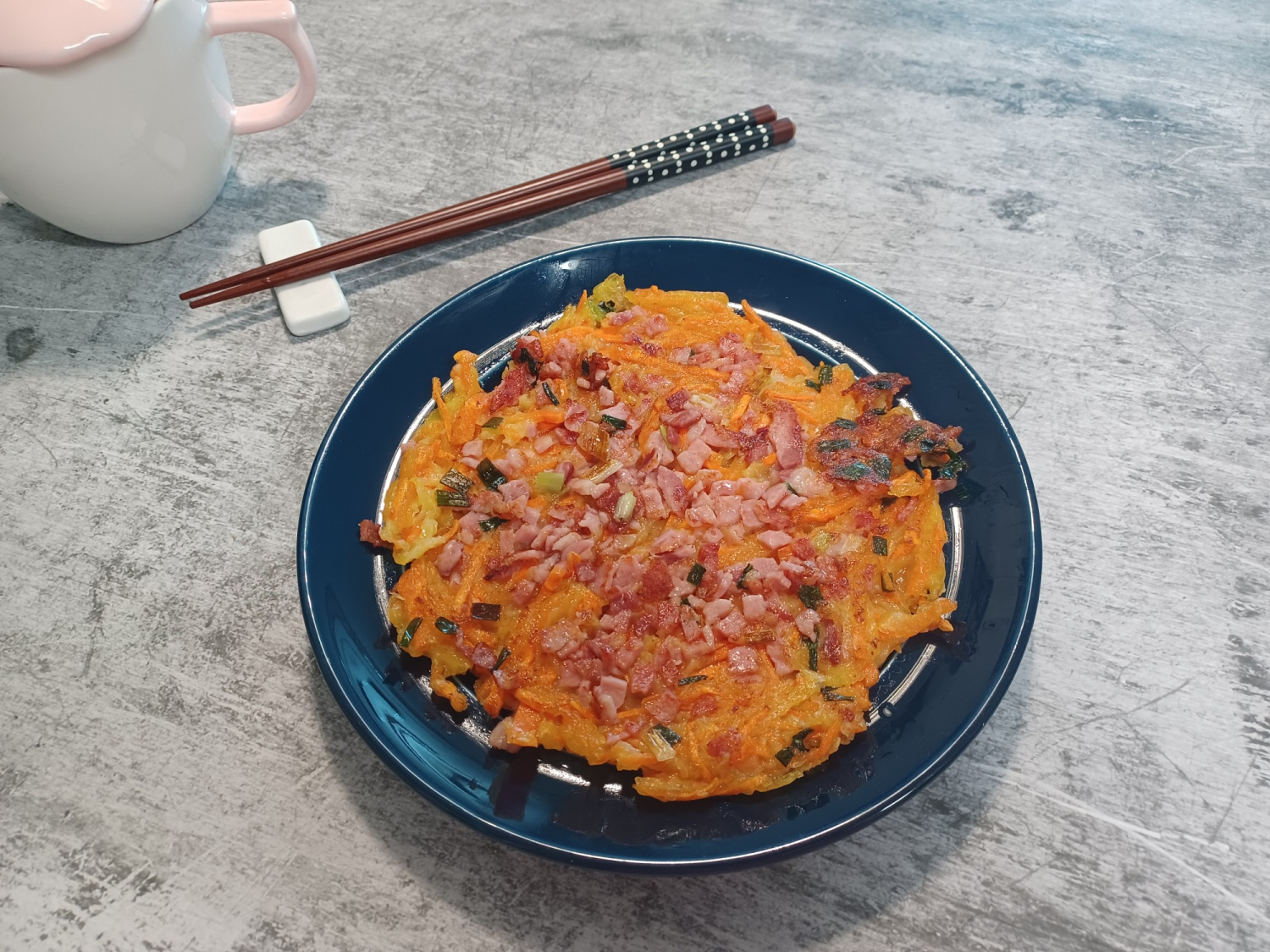 잘 구워진 당근 베이컨 전을 먹기 좋게 잘라 접시에 담아냅니다. 베이컨의 짭짤함과 당근의 달큰함이 어우러져 따로 간을 하지 않아도 딱 맞는 맛이에요. 간단하게 즐기는 맥주 안주나 든든한 브런치로 정말 훌륭한 메뉴입니다. 맛있게 드세요!