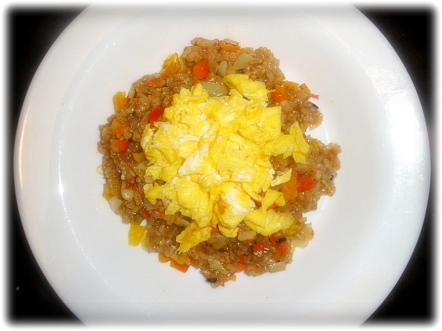 완성된 건강 채소 볶음밥 위에 방금 만든 부드러운 스크램블 에그를 보기 좋게 올려주세요. 알록달록한 채소와 노란 계란이 어우러져 더욱 먹음직스러운 한 끼가 완성됩니다.