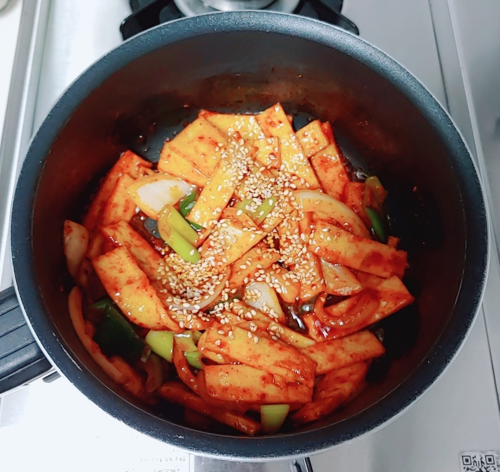 마지막으로 모든 재료에 양념이 잘 스며들면 불을 약하게 줄이고, 참기름 1큰술을 둘러 풍미를 더해줍니다. 여기에 통깨를 솔솔 뿌려 고소함을 더해주면 근사한 어묵볶음 완성! 한번 더 살짝 볶아주면 윤기가 자르르 흐르는 맛있는 어묵볶음을 맛볼 수 있습니다. 바로 드셔도 좋고, 한 김 식혀 반찬통에 담아두어도 맛있어요.