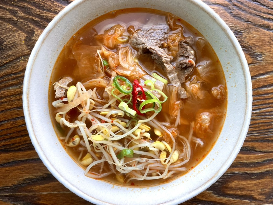우려낸 쇠고기 육수에 썰어둔 김치, 콩나물, 그리고 썰어둔 쇠고기를 모두 넣습니다. 뚜껑을 꼭 닫고 약 5분간 끓여주세요. 콩나물이 완전히 익을 때까지 뚜껑을 열지 않는 것이 중요합니다. 콩나물이 익기 전에 뚜껑을 열면 비린 맛이 날 수 있으니 주의해주세요.