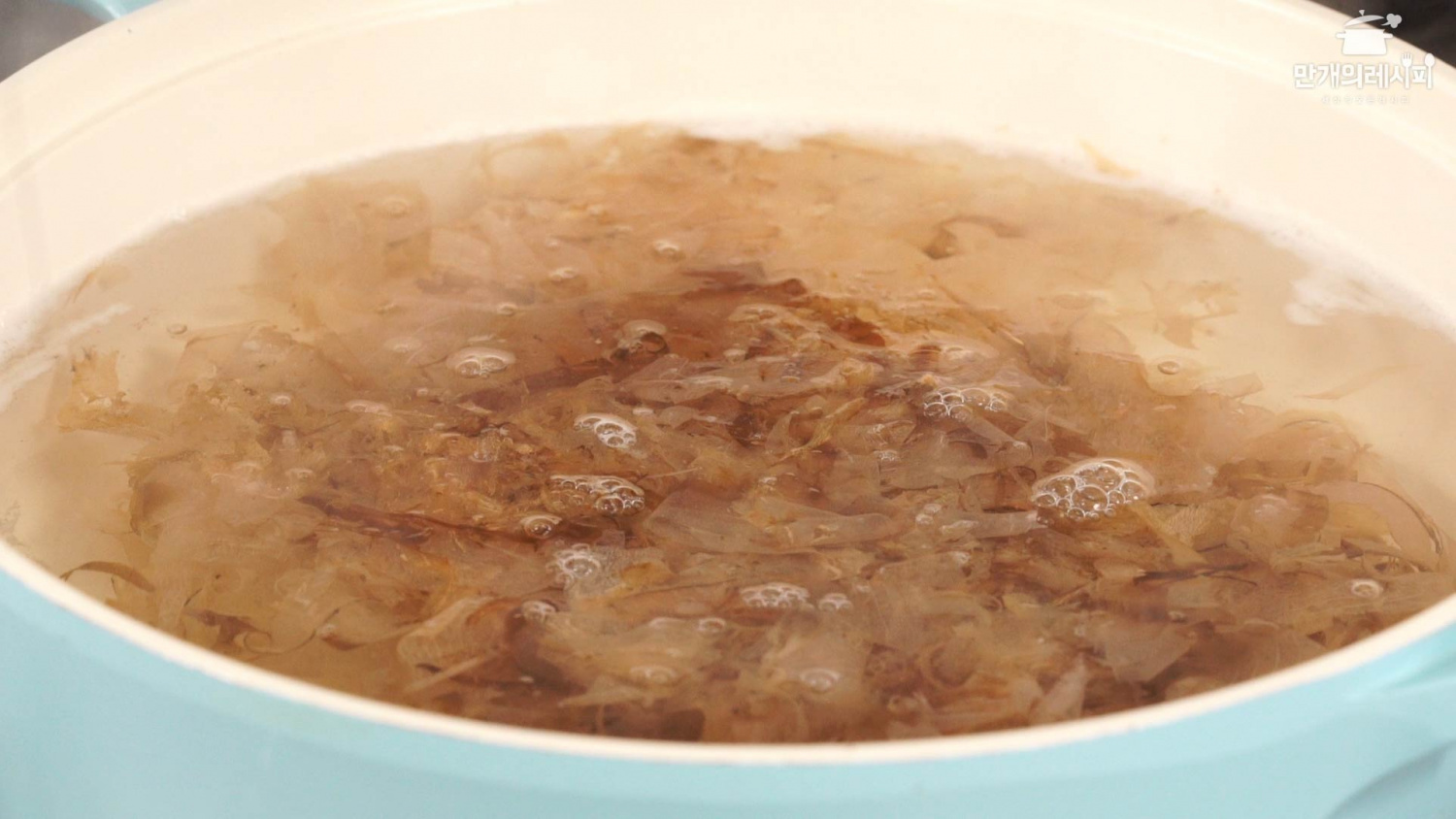 물이 끓기 시작하면, 다시마 표면에 하얀 가루가 보일 수 있는데 이때 다시마를 건져내 주세요. 다시마를 너무 오래 끓이면 쓴맛이나 끈적임이 나올 수 있으니 주의하세요. (다시마는 건져내서 조림 등으로 활용하시면 좋습니다.)