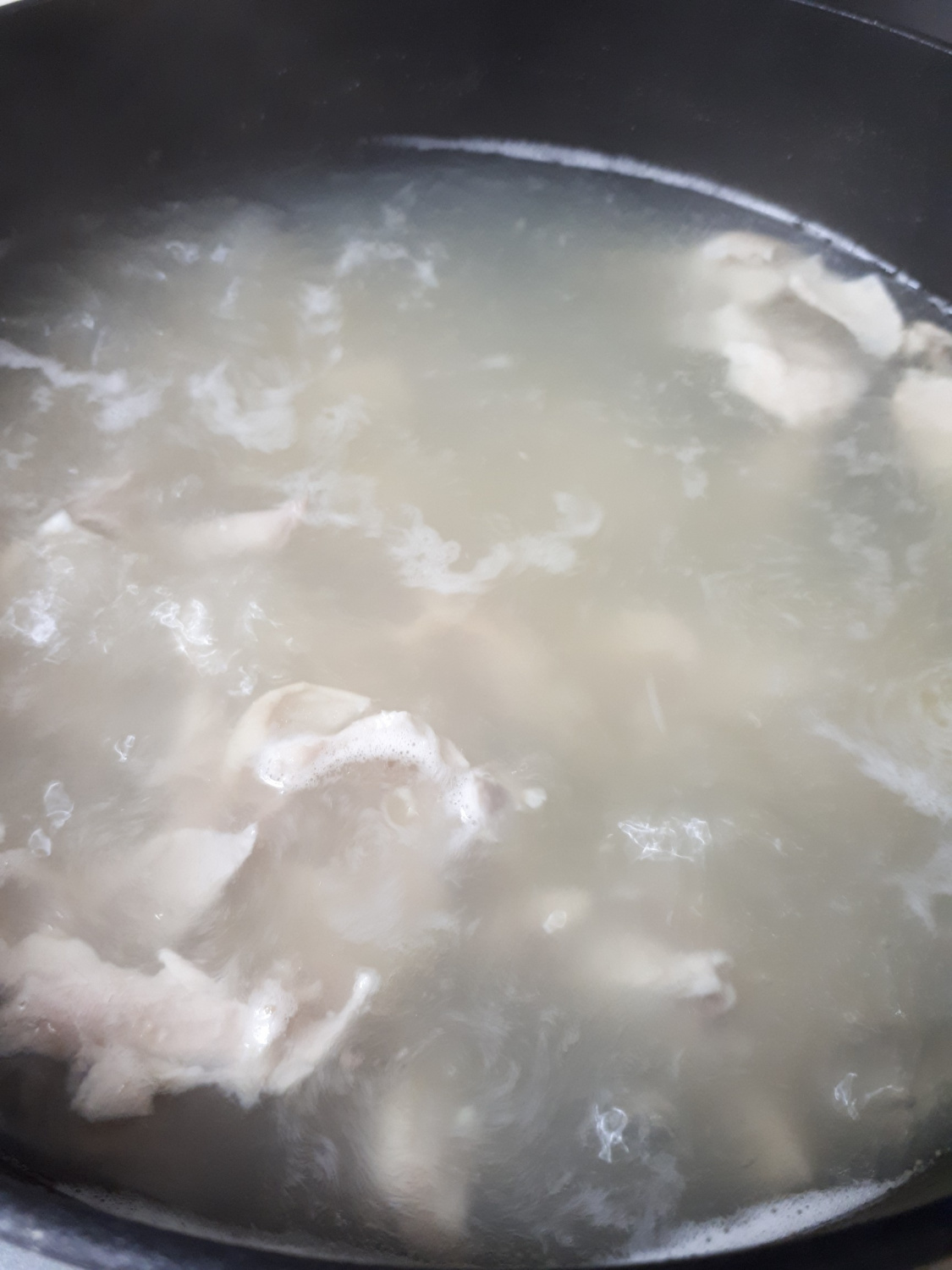 닭을 삶았던 육수에서 닭의 잡내를 없애기 위해 사용했던 통마늘, 월계수잎, 건생강, 대파를 모두 건져냅니다. 맑은 국물을 위해 육수 표면에 떠오른 닭 기름을 뜰채나 국자를 이용해 조심스럽게 걷어내주세요.