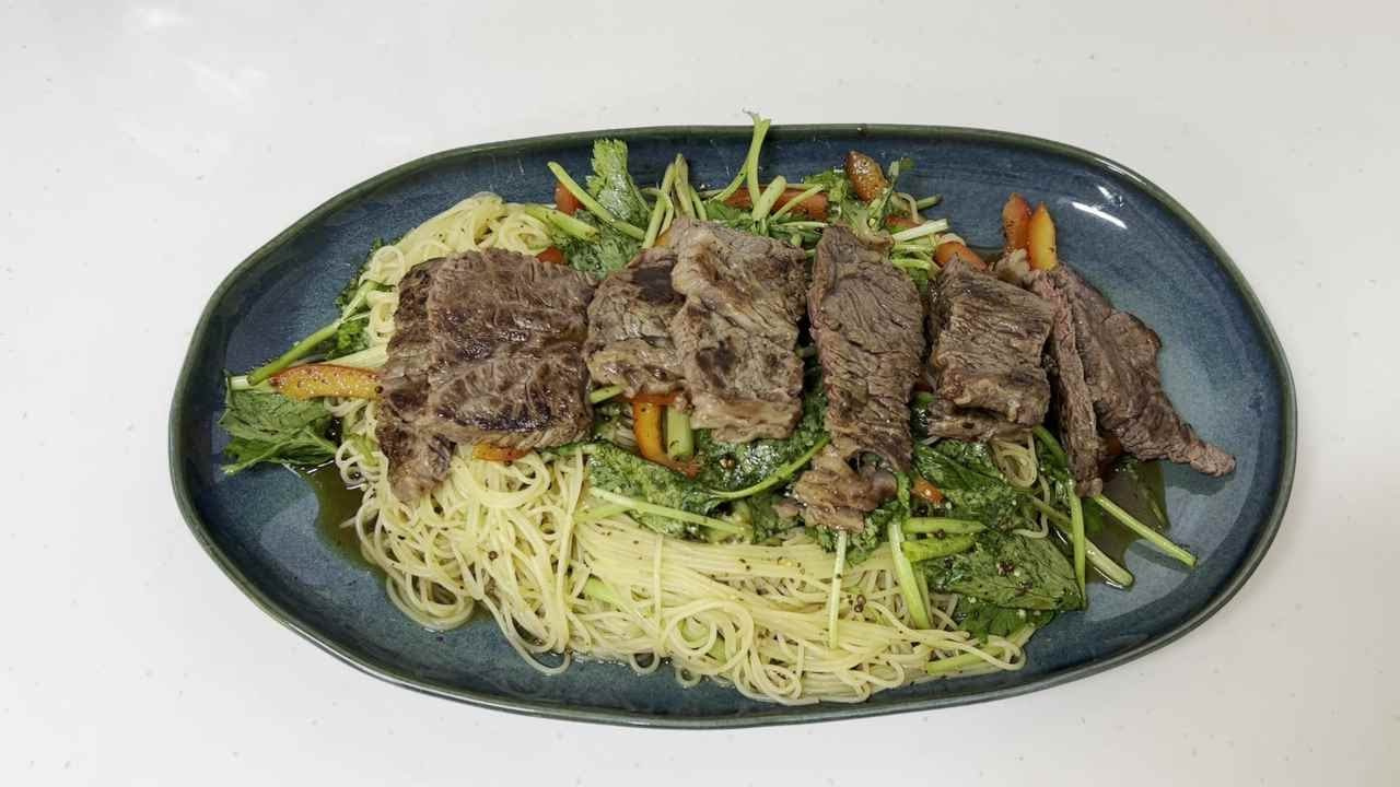 그릇에 양념에 비빈 파스타와 채소를 보기 좋게 담고, 마지막으로 먹기 좋게 잘라둔 구운 꽃등심을 넉넉하게 올려주세요. 취향에 따라 김자반까지 솔솔 뿌려주면 완성입니다. 맛있는 꽃등심 비빔국수를 즐겨보세요!