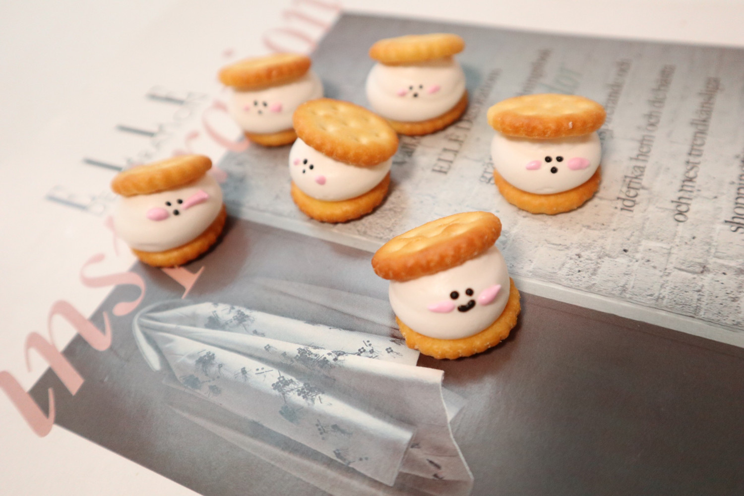 머랭 위에 다른 크래커를 올려 살포시 눌러줍니다. 머랭이 크래커 사이로 살짝 퍼지면서 모양이 예쁘게 잡힙니다. 너무 세게 누르면 머랭이 뭉개질 수 있으니 주의하세요.