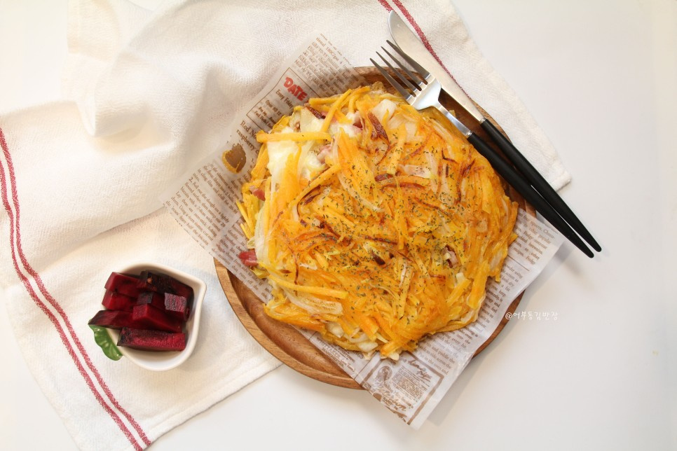 마지막으로 두 번째로 부쳐 놓은 호박전을 치즈 위에 덮어주고, 팬 뚜껑을 닫아 약불에서 5분 정도 더 익혀줍니다. 치즈가 완전히 녹아내리고 모든 재료가 잘 어우러질 때까지 가열하면 맛있는 늙은 호박 피자가 완성됩니다. 치즈가 녹는 것을 보면서 시간을 조절해주세요.