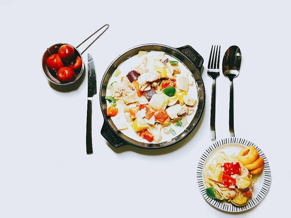 잘 익은 고구마와 부드러운 닭고기, 아삭한 채소가 어우러진 고구마 크림 스튜가 완성되었습니다! 따뜻하게 데운 빵과 곁들이거나, 삶은 스파게티 면 위에 부어 크림 파스타처럼 즐겨도 맛있습니다. 밥에 비벼 먹으면 아이들부터 어른까지 모두 좋아하는 든든한 한 끼 식사가 됩니다. 마지막으로 송송 썬 대파를 올려내면 더욱 좋습니다.