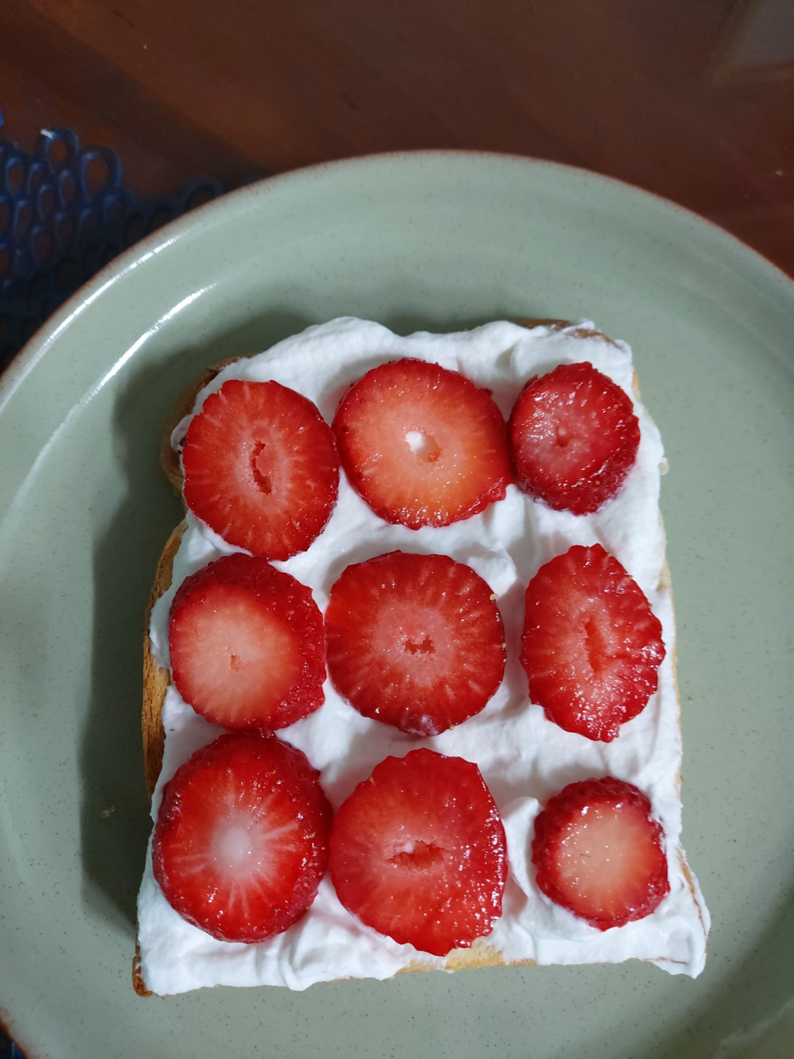 잘 구워진 식빵 위에 준비된 생크림을 넉넉하게 발라주세요. 그 위에 보기 좋게 슬라이스한 딸기를 예쁘게 올려 장식합니다. 딸기를 듬뿍 올려주면 더욱 먹음직스러워 보입니다.