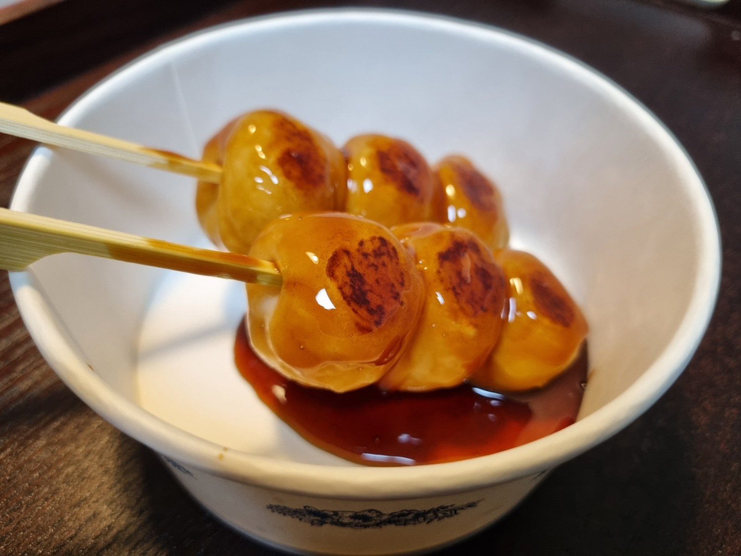 마지막으로, 꼬치 위에 남은 소스를 넉넉하게 끼얹어주면 달콤 짭짤한 미타라시 당고 완성입니다! 따뜻할 때 바로 드시는 것이 가장 맛있답니다.