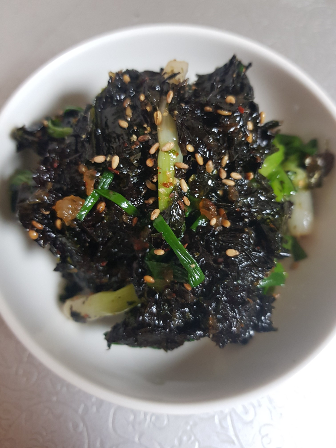 이제 김과 쪽파를 준비해볼까요? 곱창김 5장은 마른 팬에 앞뒤로 살짝 구워줍니다. 김이 너무 바삭해지지 않도록 주의하세요. 구운 김은 먹기 좋은 크기(약 2-3cm 조각)로 잘게 부숴 비닐봉투나 넓은 볼에 담아둡니다. 쪽파는 깨끗이 씻어 물기를 제거한 후, 끓는 물에 소금 1/2작은술을 넣고 15-20초 정도만 살짝 데쳐줍니다. 쪽파를 너무 오래 데치면 물러지니 아삭한 식감을 살리는 것이 중요해요. 데친 쪽파는 찬물에 헹궈 열기를 식힌 후, 4-5cm 길이로 썰어 준비해 둔 김 위에 올려줍니다.