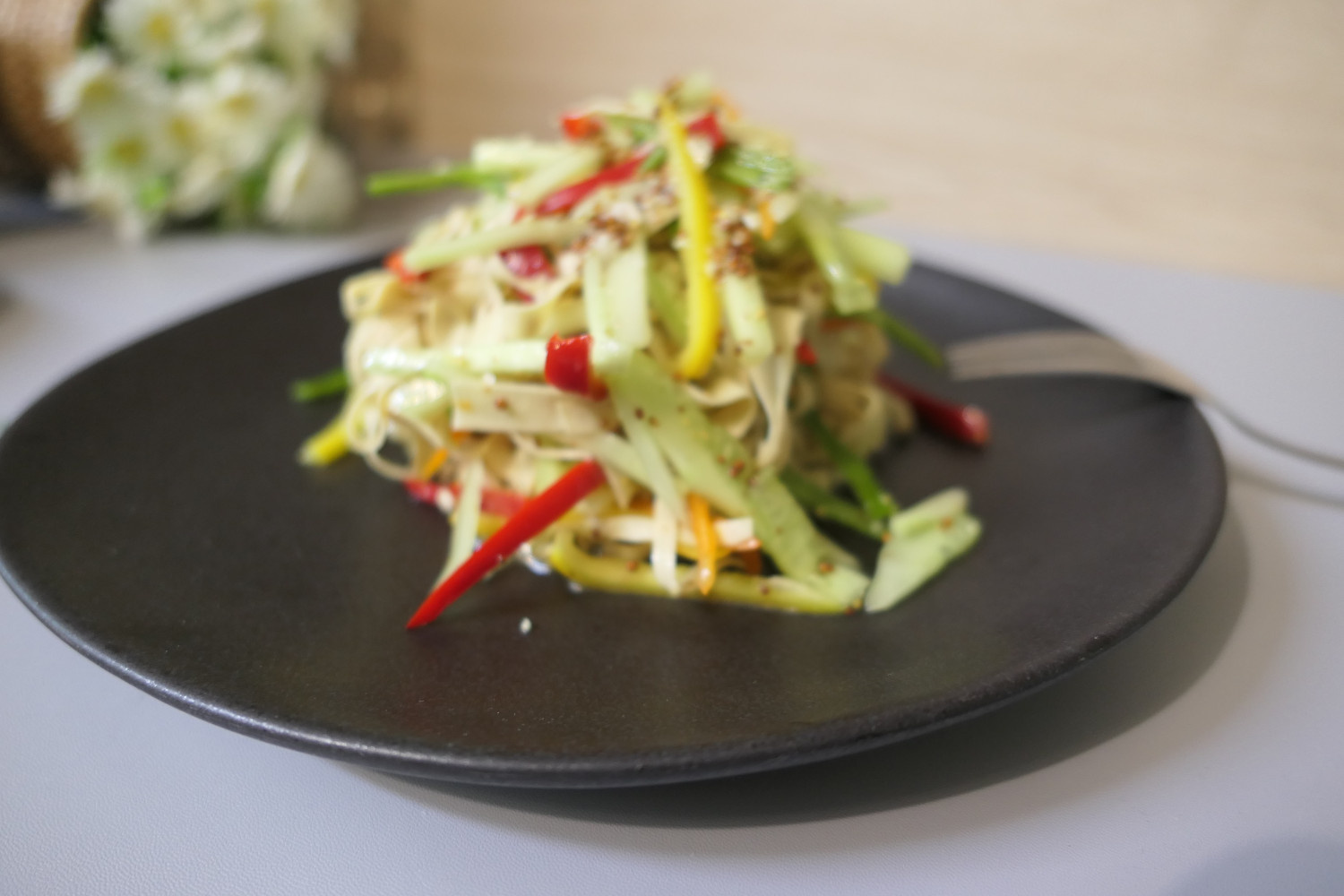 마지막으로 물기를 제거한 포두부 면을 채소와 함께 볼에 담고, 남은 드레싱을 모두 넣어 조심스럽게 버무려주면 맛있는 포두부 샐러드 완성입니다!