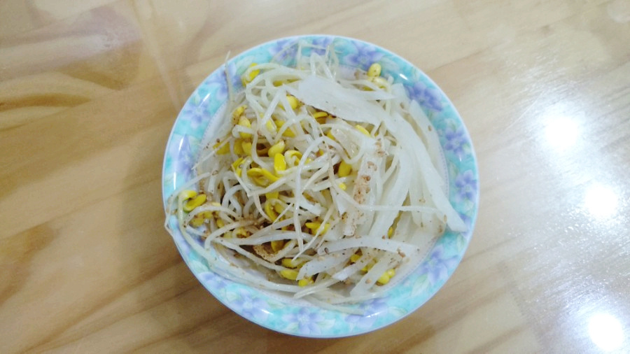 마지막으로, 완성된 무와 콩나물 나물 위에 통깨를 솔솔 뿌려 고명으로 장식해주세요. 고소한 깨소금이 더해지면 풍미가 더욱 살아나고 보기에도 좋습니다. 이렇게 하면 정갈하고 맛있는 명절 나물 반찬, 혹은 평소 건강한 한 끼 식탁을 위한 훌륭한 곁들임 반찬이 완성됩니다.