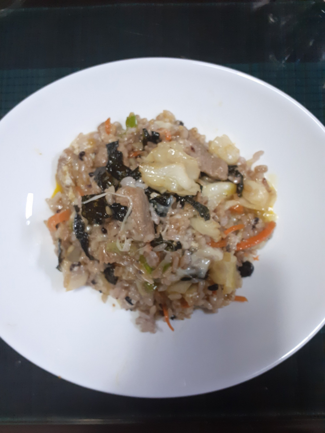 마지막으로 조미김을 부수거나 잘게 잘라 볶음밥 위에 올립니다. 김의 감칠맛이 볶음밥 전체의 맛을 한층 끌어올려 줄 거예요. 밥과 김이 잘 섞이도록 가볍게 한번 더 섞어주면 맛있는 목살 볶음밥 완성입니다!