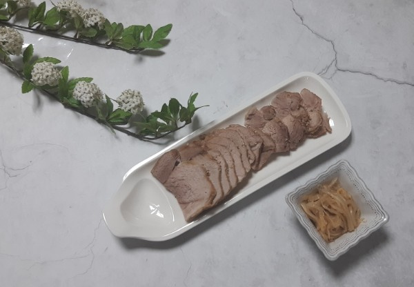 잘 익은 수육을 도마에 꺼내 살짝 식힌 후, 먹기 좋은 0.5cm 두께로 썰어주세요. 너무 뜨거울 때 썰면 부서질 수 있으니 주의하세요.