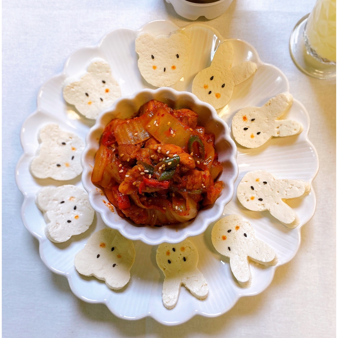 미리 만들어 둔 귀여운 두부 캐릭터들을 두루치기 주변이나 위에 예쁘게 장식하여 플레이팅 해주시면, 근사한 요리가 완성됩니다.