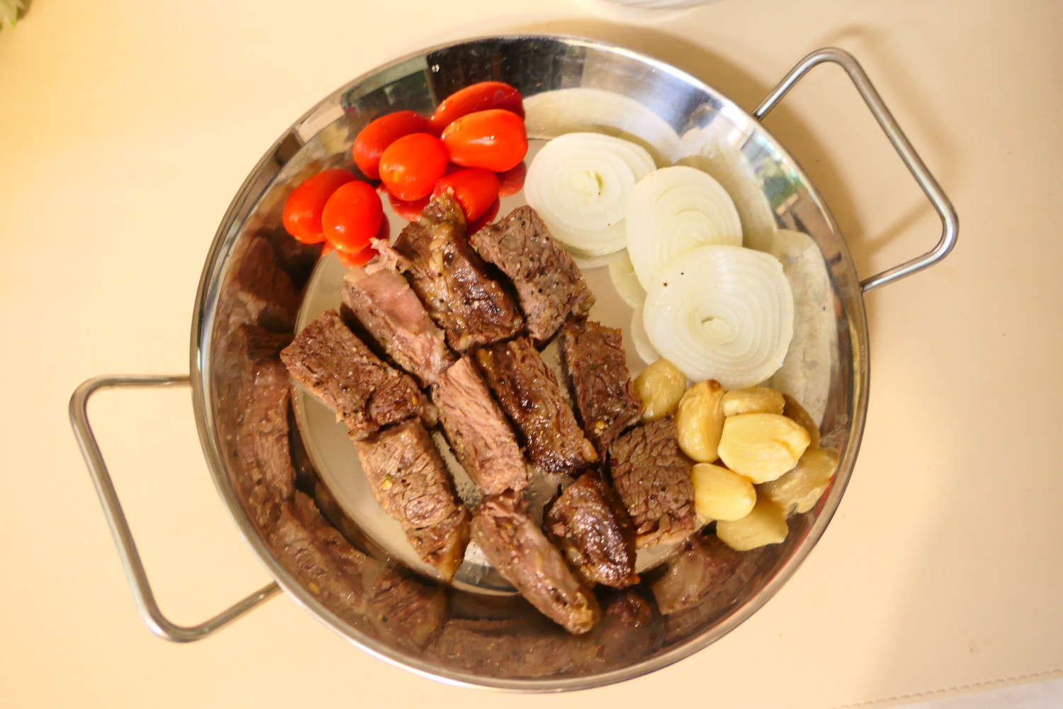 15분 후, 스테이크를 오븐에서 꺼내 뒤집어 주세요. 이때, 곁들여 먹기 좋은 양파와 통마늘을 스테이크 주변에 함께 넣어주세요. 향긋한 채소가 스테이크의 풍미를 더욱 깊게 만들어 줄 거예요. 다시 오븐에 넣고 195°C (385°F)에서 10분 더 구워줍니다.