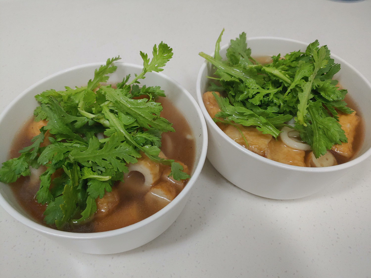 국자로 우동과 국물을 예쁜 그릇에 보기 좋게 담아낸 뒤, 신선한 쑥갓 한 줌을 보기 좋게 올려주면 맛있는 어묵우동 완성입니다! 따뜻할 때 바로 즐겨보세요.