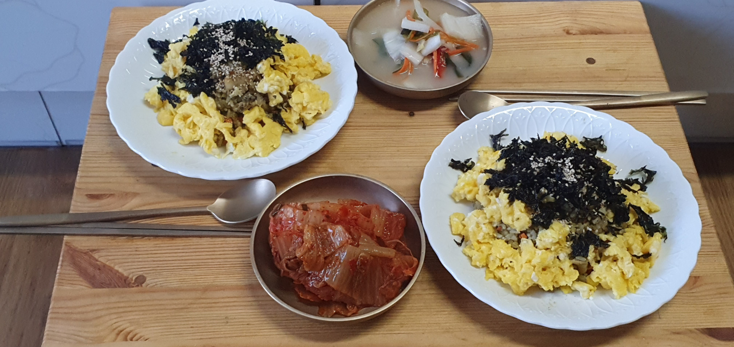 마지막으로 고소함과 풍미를 더할 토핑을 뿌려 마무리합니다. 볶음밥 위와 계란 스크램블 위에 통깨를 솔솔 뿌려주고, 취향에 따라 김가루를 적당량 뿌려주면 맛과 향이 더욱 풍부해집니다. 이렇게 류수영 셰프의 특별한 전복 내장 볶음밥이 완성되었습니다. 맛있게 즐기세요!
