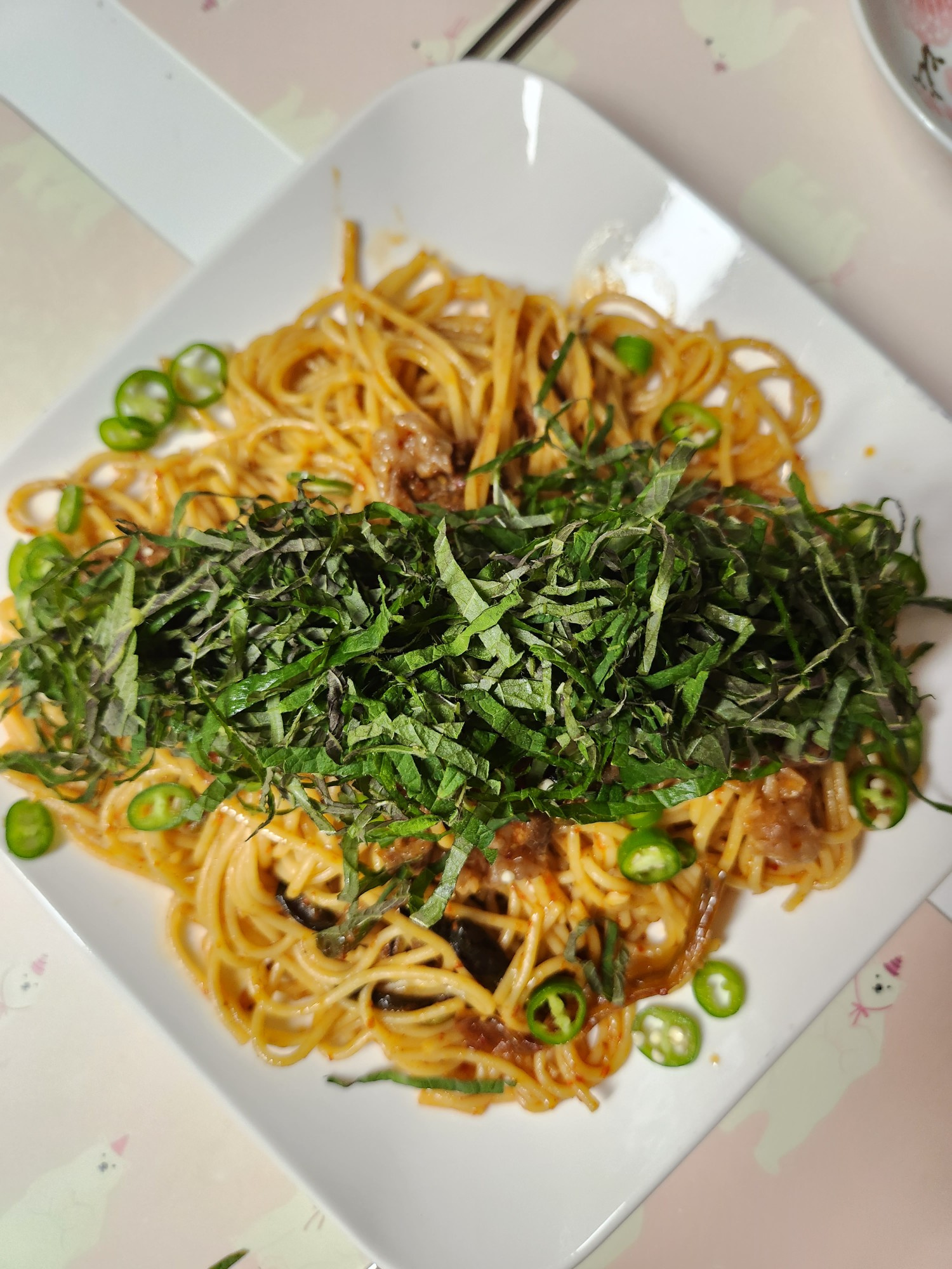 마지막으로, 준비해둔 채 썬 청양고추와 깻잎을 파스타 위에 보기 좋게 올려주면 매콤달콤한 류수영식 차돌박이 볶음 파스타가 완성됩니다. 맛있게 즐기세요!