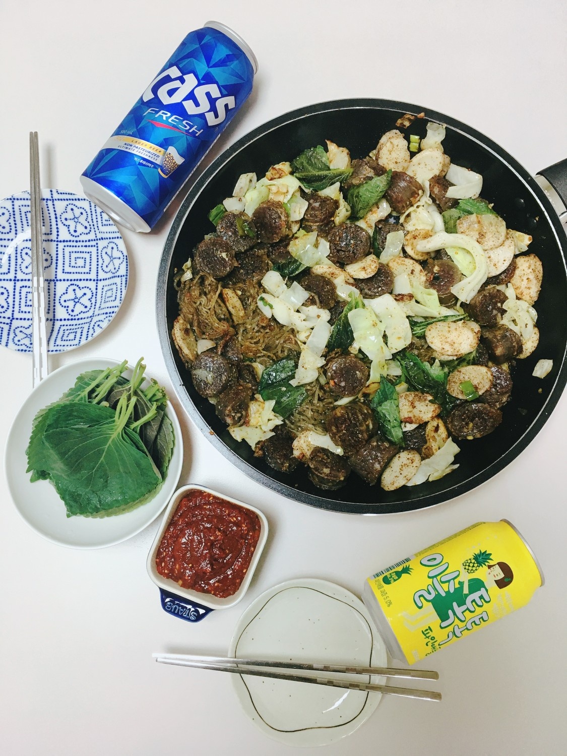 넓은 팬에 썰어둔 백순대, 큼직하게 썬 양배추, 떡국떡, 불린 당면, 송송 썬 대파, 그리고 얇게 썬 청양고추(매운맛을 좋아하시면)를 모두 넣어주세요.