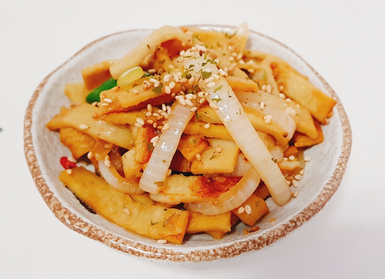 마늘이 은은한 갈색빛을 띠기 시작하면, 준비해둔 양파와 어묵을 넣고 센 불에서 빠르게 볶아주세요. 센 불에서 볶아야 어묵의 쫄깃한 식감을 살릴 수 있습니다.