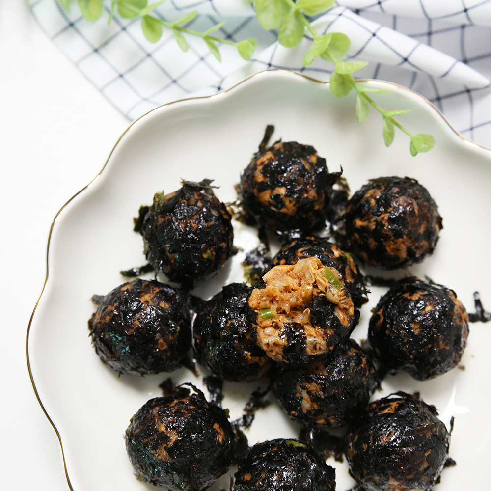 모양을 낸 주먹밥을 김가루 위에 올리고 앞뒤로 살살 굴려가며 골고루 묻혀줍니다. 김가루가 충분히 묻으면 먹음직스러운 고추장 참치 주먹밥 완성! 그대로 맛있게 즐기세요.