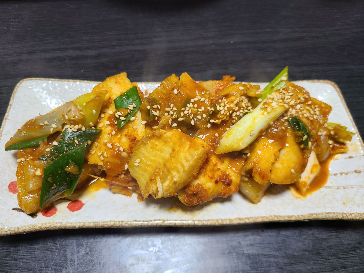 국물이 자작하게 졸아들어 밥 비벼 먹기 좋은 농도가 되면, 마지막으로 어슷 썬 대파를 넣고 살살 섞어줍니다. 그리고 약불로 줄여 2분 정도 뜸을 들이듯이 더 끓여주면 맛있는 가자미조림이 완성됩니다.
