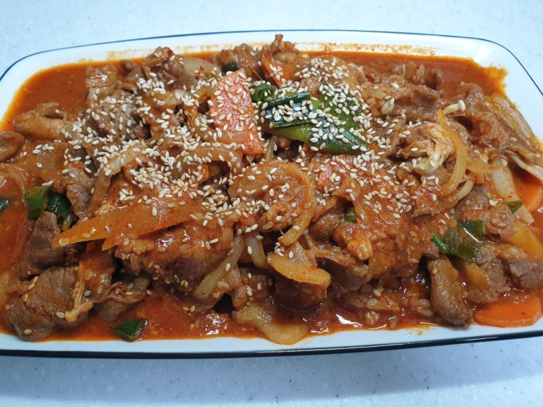 고기가 거의 다 익었으면, 미리 썰어둔 양파, 당근, 청양고추를 넣고 함께 볶아줍니다. 채소의 아삭한 식감을 살리려면 너무 오래 볶지 않도록 주의하세요.