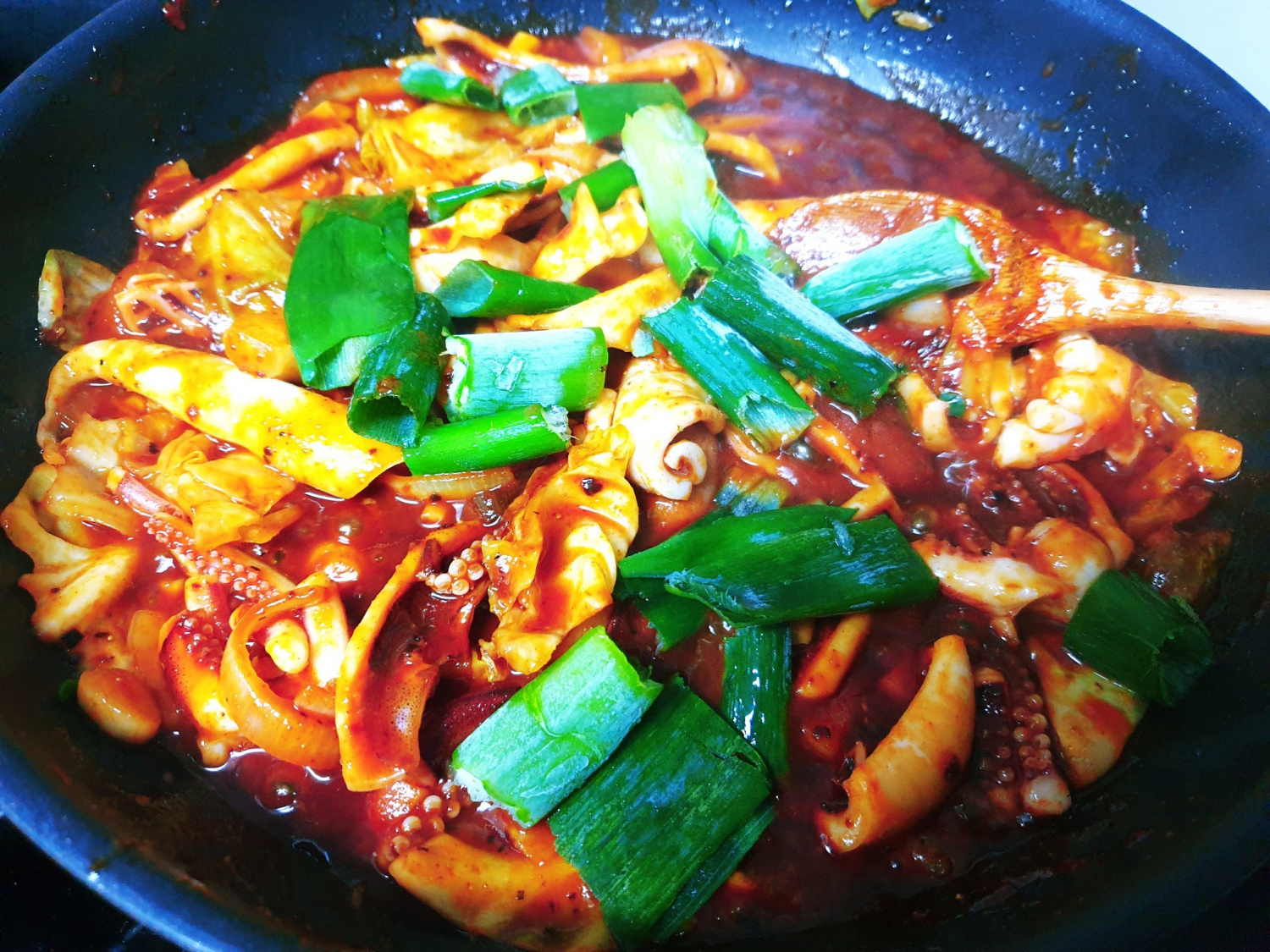 마무리 단계입니다. 먹기 좋게 썬 대파 2대를 넣고 살짝만 더 볶아 파의 향긋함을 살려줍니다. 고루 섞어주면 맛있는 오징어 고추장 두루치기 완성입니다! 맛있게 드세요.