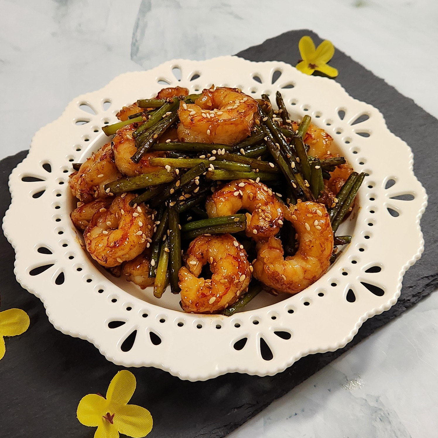 그리고 고소한 풍미를 더해줄 참깨 1큰술을 솔솔 뿌린 후, 팬을 살짝 기울여 모든 재료가 기름과 함께 휘리릭 섞이도록 윤기 나게 마무리해줍니다. 이렇게 맛있는 새우 마늘쫑볶음이 완성되었습니다!