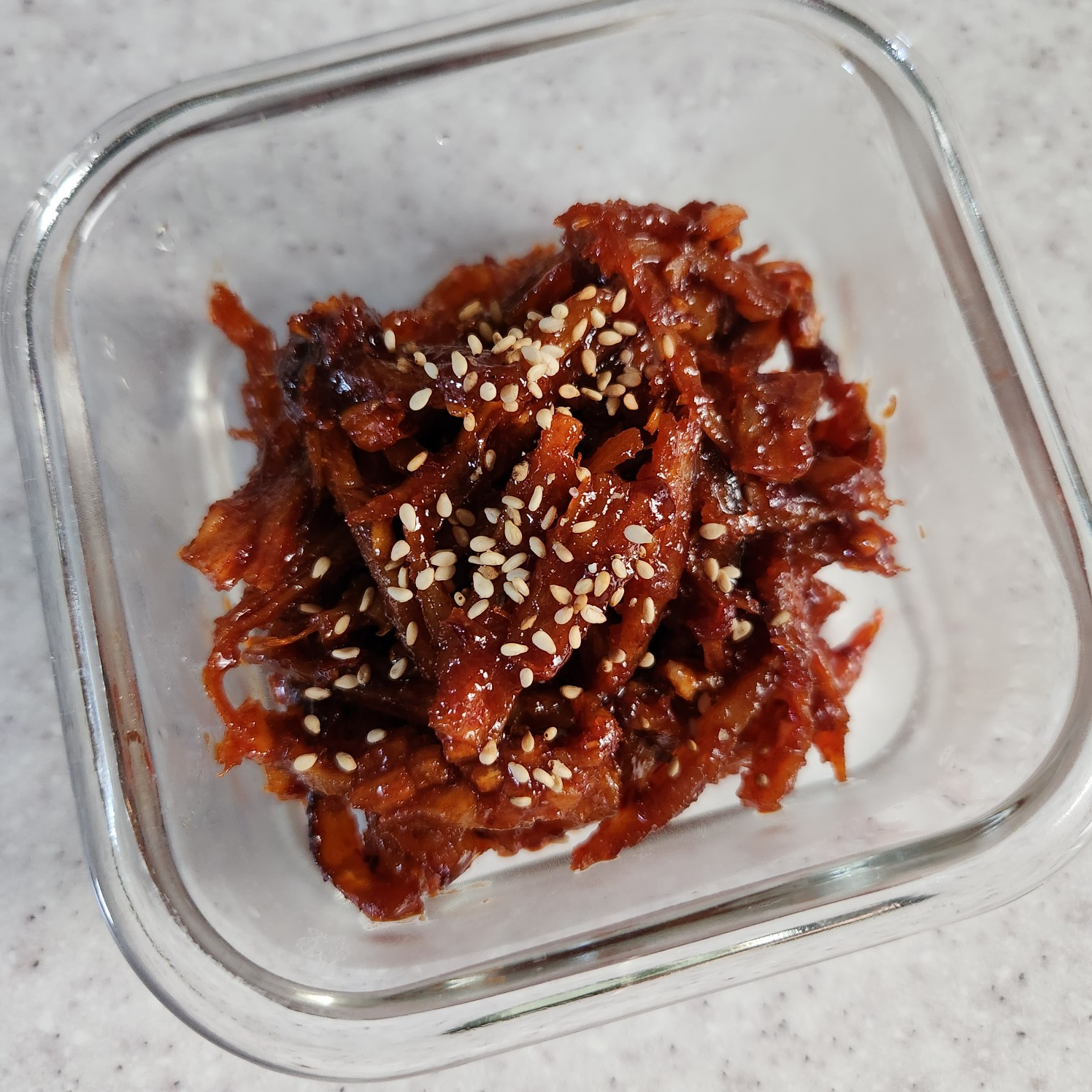 다 무쳐진 진미채는 완전히 식혀주세요. 식힌 후에는 깨끗한 밀폐용기에 담고, 위에 통깨를 솔솔 뿌려주세요. 이렇게 하면 보기에도 좋고 고소한 맛도 더해집니다. 냉장고에 보관하시면 며칠 동안 맛있게 즐길 수 있는 훌륭한 밑반찬이 됩니다.