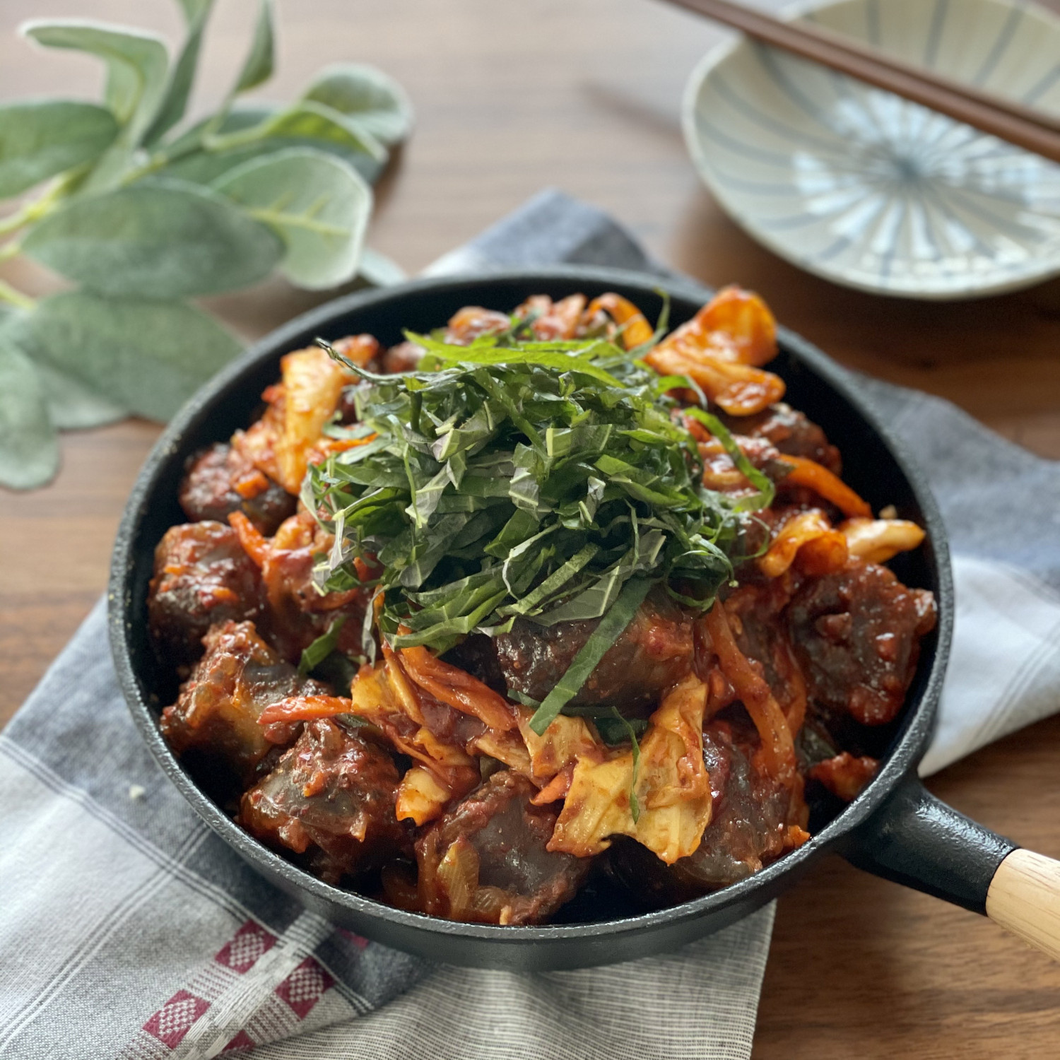 자, 맛있는 순대볶음이 완성되었습니다! 따뜻한 그릇에 먹음직스럽게 담아내고, 미리 채 썰어둔 깻잎을 보기 좋게 올려주세요. 향긋한 깻잎과 함께라면 더욱 맛있게 즐기실 수 있답니다. 맛있는 순대볶음으로 즐거운 시간 보내세요!