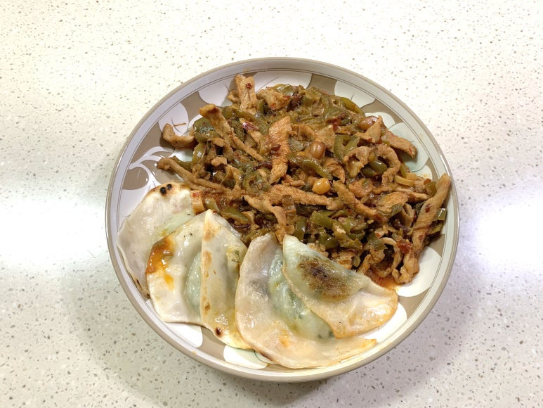 완성된 고추잡채는 먹음직스러운 접시에 보기 좋게 담아냅니다. 곁들임으로는 꽃빵 대신, 팬에 기름을 넉넉히 두르고 납작 만두를 앞뒤로 노릇하게 튀기듯이 구워 함께 냈습니다. 따끈한 밥 위에 얹어 덮밥으로 즐겨도 좋고, 특히 고기만두와 함께 먹으면 만두를 찍어 먹을 초간장 없이도 만두 자체로도 맛있는 조화를 이룬답니다. 맛있게 즐기세요!