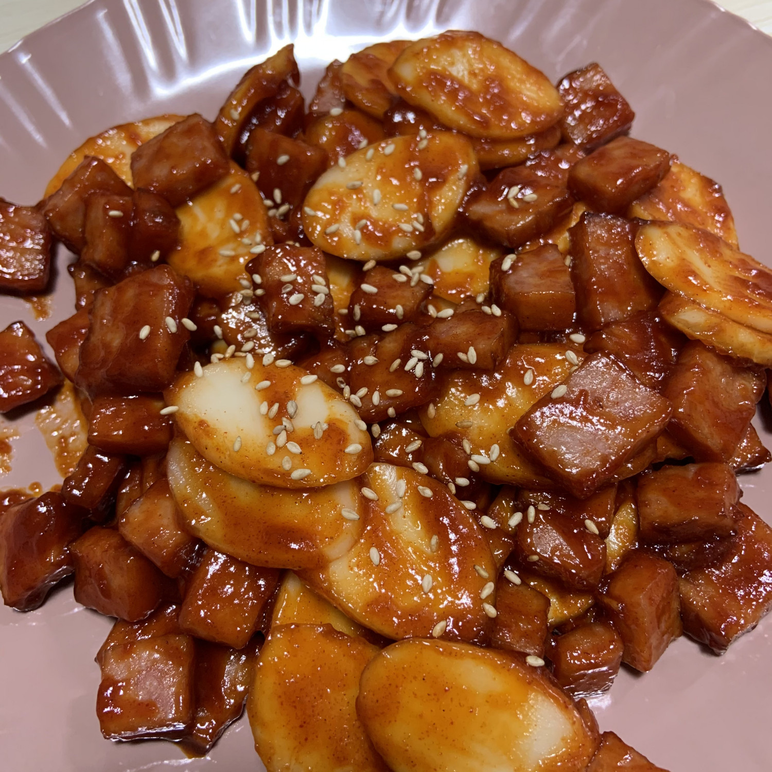 매콤달콤 짭짤한 햄떡 완성입니다! 닭강정처럼 바삭한 견과류를 잘게 부숴 위에 솔솔 뿌려 드시면 씹는 맛과 고소함을 더해 더욱 맛있게 즐기실 수 있어요. 뜨거울 때 바로 드시면 가장 맛있습니다.