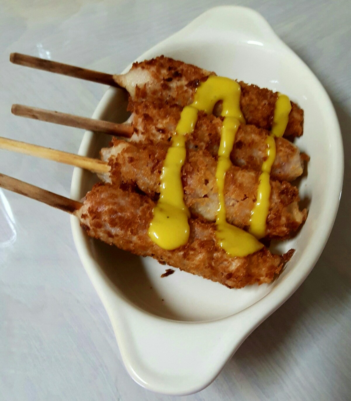 소시지에 찹쌀 반죽을 옷 입혀주세요. 꼬치에 꽂은 소시지를 만들어둔 찹쌀 반죽에 퐁당 담가주세요. 젓가락이나 꼬치를 이용해 소시지 표면에 찹쌀 반죽이 골고루 묻도록 잘 입혀줍니다. 반죽이 너무 묽으면 잘 묻지 않으니 농도를 다시 한번 확인해주세요.