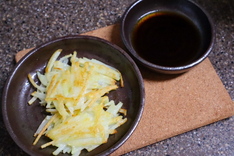 바삭하게 잘 부쳐진 감자채전과 맛있는 간장소스를 함께 곁들이면 맛있는 요리 완성입니다! 따뜻할 때 바로 드시는 것이 가장 맛있으니, 즐거운 식사 시간 되세요!